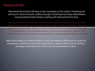 Oman has historically been an important trade hub for frankincense and myrrh. In the 20th century, it gained geopolitical significance due to its oil production and strategic location along the Strait of Hormuz, through which a large portion of global oil shipments pass. The country experienced periods of isolation and declining influence after the death of certain sultans. Currently, Sultan Qabus bin Said al Said rules as both the head of state and government. Oman maintains strong alliance relationships with both the United Kingdom and United States through historical friendship treaties.