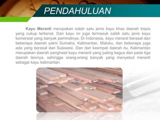 Kayu meranti merupakan kayu komersial penting di Asia Tenggara yang dikenal berasal dari daerah tropis, terutama Kalimantan, dengan karakteristik kayu keras yang memiliki variasi warna. Penggunaan utama kayu meranti mencakup konstruksi bangunan, perabotan, dan keperluan lainnya, meskipun kayu ini tidak tahan terhadap cuaca dan perlu diawetkan untuk meningkatkan daya tahannya. Pengawetan dapat dilakukan dengan berbagai metode, termasuk perendaman dan pengawetan vakum yang lebih modern.
