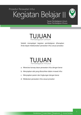 Dokumen tersebut membahas tentang tujuan pembelajaran umum dan khusus, kegiatan belajar, uraian materi, dan format penilaian terkait dengan prosedur perawatan infus."