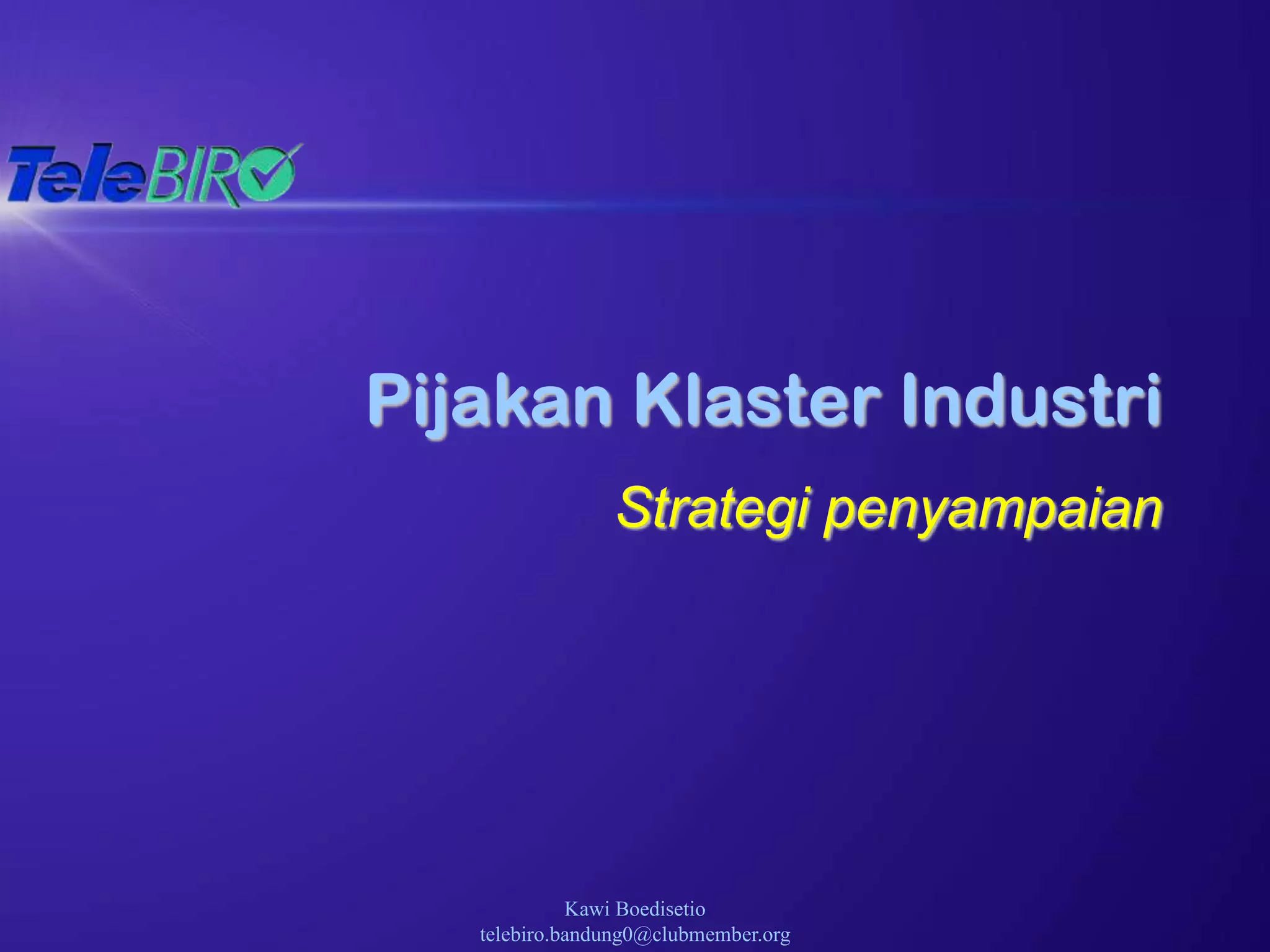 Dokumen ini membahas pijakan klaster industri sebagai strategi untuk meningkatkan daya saing melalui kolaborasi antara berbagai pelaku, dengan penekanan pada perlunya memahami karakteristik masing-masing kelompok. Hambatan yang dihadapi termasuk kurangnya perencanaan terstruktur dan komitmen jangka panjang, serta dominasi paradigma lama dalam berbagai instansi. Ditekankan bahwa klaster industri tidak dapat diciptakan tetapi harus dirangsang dan diperkuat oleh pemerintah dengan langkah-langkah yang tepat.