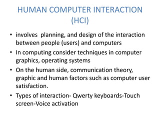 This document discusses human-computer interaction (HCI) and key related concepts. HCI involves planning and designing the interaction between users and computers, considering both computer techniques like graphics and operating systems, as well as human factors. Usability measures how easy a device is to use and learn, whether software, websites, or machines. There are three types of users - novice users focus on basic functions, intermittent users use basic and shortcut keys across keyboards and touchscreens, and expert users leverage voice activation and view computers as business tools.