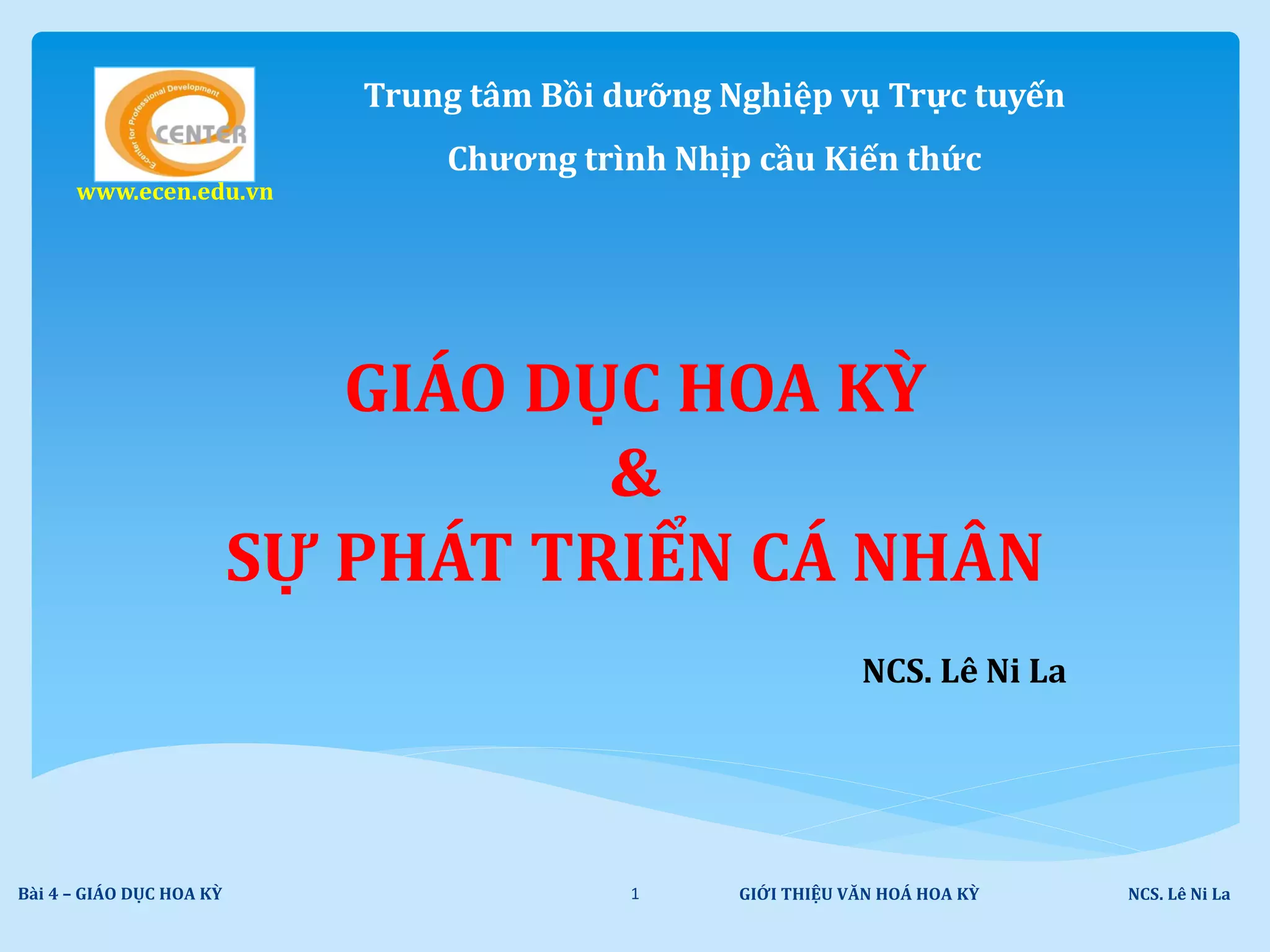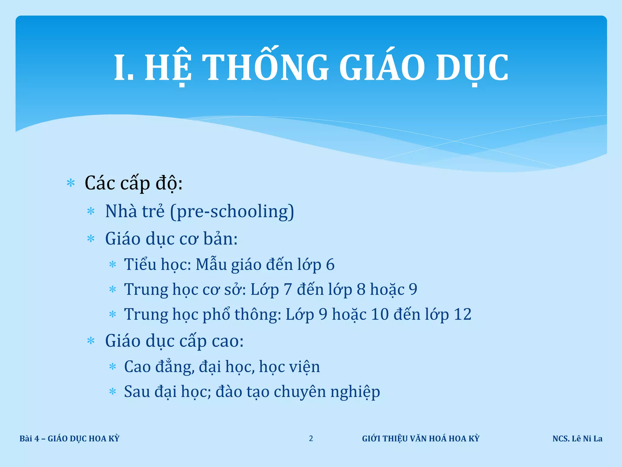 Tài liệu cung cấp cái nhìn tổng quan về hệ thống giáo dục Mỹ, bao gồm các cấp độ giáo dục từ nhà trẻ đến đại học và các loại hình giáo dục. Nó nhấn mạnh vai trò của chính quyền địa phương và các đặc trưng của nền giáo dục như tính cạnh tranh và sự phát triển cá nhân. Ngoài ra, tài liệu cũng đề cập đến các cơ sở giáo dục đại học và quy trình tuyển sinh.