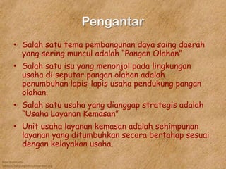 Dokumen tersebut membahas rencana pembentukan unit-unit layanan kemasan untuk mendukung industri pangan olahan. Terdapat beberapa unit layanan yang direncanakan seperti unit konsultasi kemasan, desain grafis, pembuatan kemasan, serta serangkaian kegiatan pendukung seperti pelatihan.