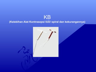 Dokumen tersebut memberikan ringkasan tentang kelebihan dan kekurangan alat kontrasepsi IUD/spiral. Kelebihan IUD adalah tingkat efektivitasnya yang tinggi (0,6-0,8%), langsung efektif setelah dipasang, tidak menimbulkan efek samping hormonal, dan dapat digunakan oleh ibu menyusui. Kekurangannya adalah memerlukan prosedur medis untuk pemasangan, dapat menimbulkan sakit dan