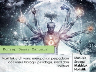 Dokumen ini membahas konsep dasar kesehatan dan penyakit, serta faktor-faktor yang mempengaruhi kondisi sehat dan sakit pada manusia. Selain itu, dijelaskan tentang stres, adaptasi tubuh, dan manajemen stres yang mencakup berbagai metode untuk menjaga keseimbangan fisik dan psikologis. Terakhir, dokumen ini menekankan pentingnya pencegahan primer untuk mempertahankan kesehatan individu.
