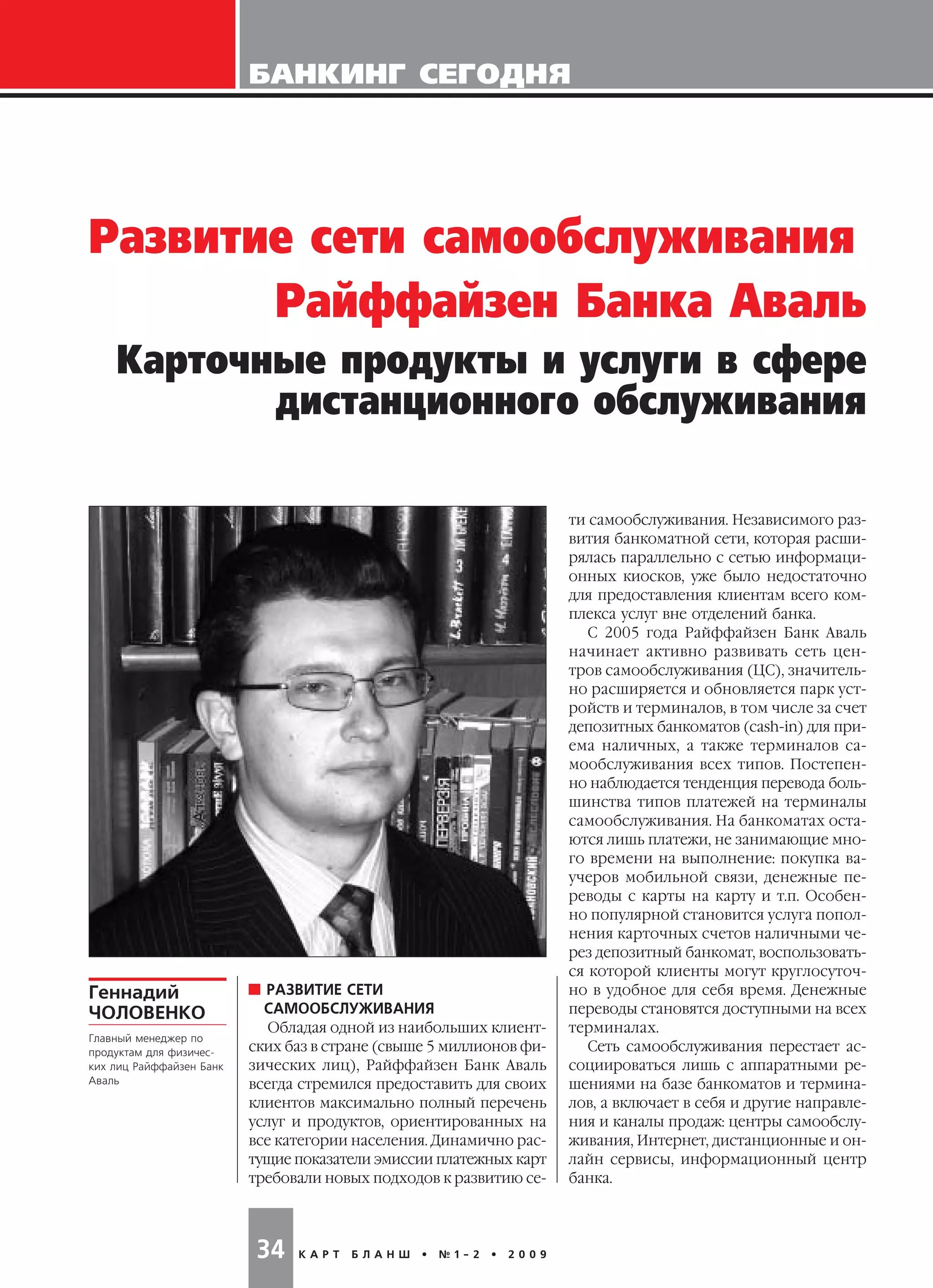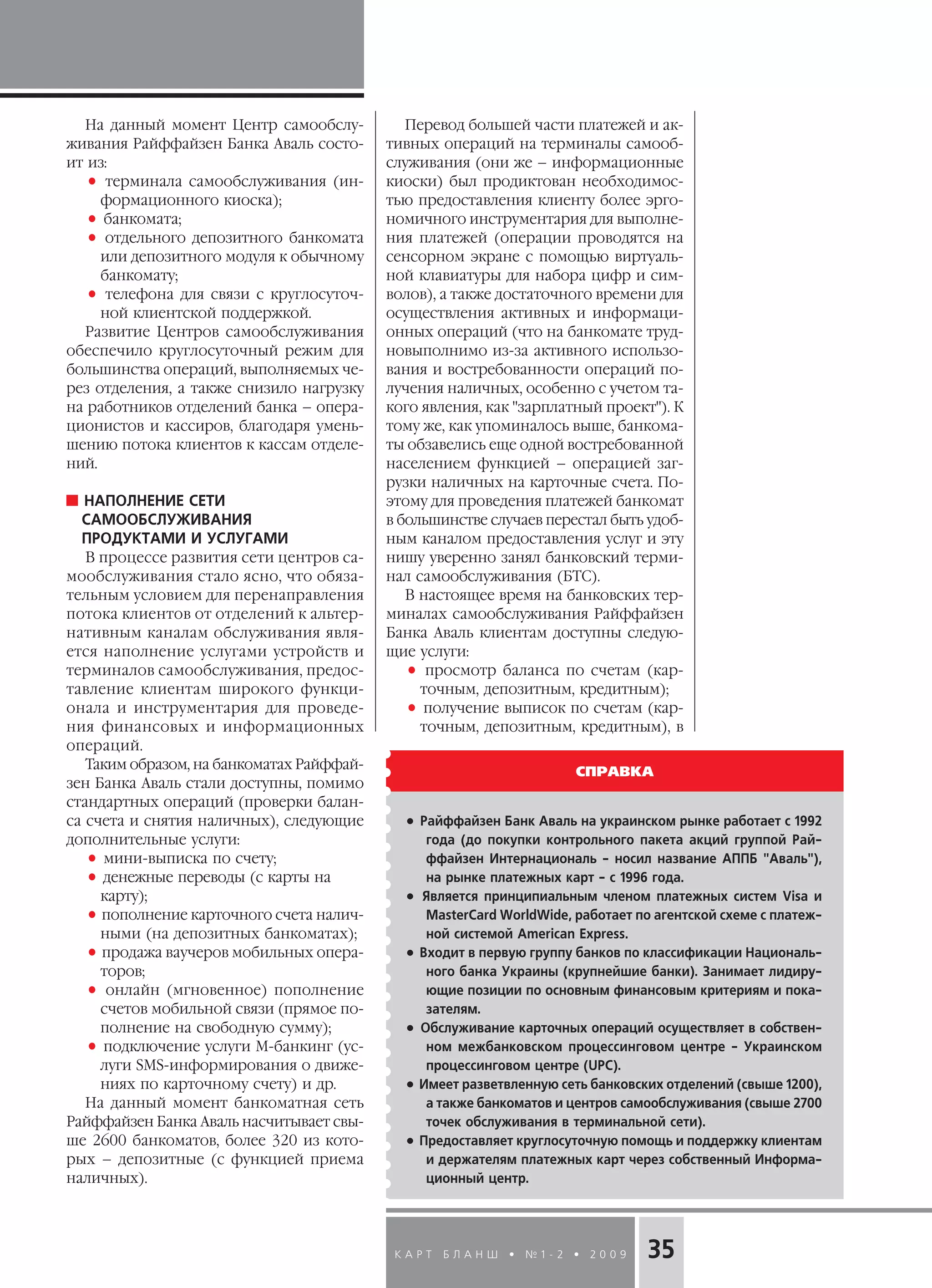 Документ описывает развитие сети самообслуживания Райффайзен банка Аваль, которая включает терминалы самообслуживания и депозитные банкоматы, предлагающие разнообразные банковские услуги. С момента начала активного расширения в 2005 году, банк значительно улучшил функционал своих устройств, предлагая такие услуги, как денежные переводы, онлайн пополнение карточных счетов и оплату различных услуг. В результате этого клиентам обеспечивается круглосуточный доступ к банкингу и значительное сокращение очередей в отделениях.