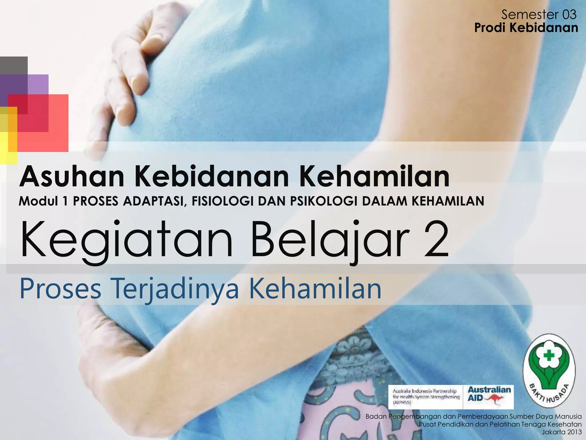 Dokumen ini membahas tentang proses kehamilan, termasuk siklus menstruasi, fertilisasi, dan implantasi. Menjelaskan tahapan fisiologis dan hormonal dari siklus menstruasi, serta peran trofoblas dalam pembentukan plasenta yang mendukung perkembangan janin. Dokumen juga membahas fungsi-fungsi plasenta seperti transfer nutrisi, respirasi, ekskresi, dan pembentukan hormon sepanjang kehamilan.