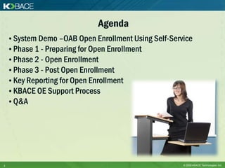 This document outlines the key phases and steps for effectively planning and executing an open enrollment process within Oracle Advanced Benefits. It discusses preparing for open enrollment by validating configurations, cleaning up data, and running a mock open enrollment. During open enrollment, the speaker recommends running required processes, monitoring life events, and closing enrollment once complete. Post open enrollment involves validating elections and coverage, managing life events, and generating key reports. KBACE offers support services throughout the entire open enrollment process.