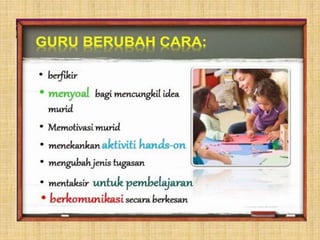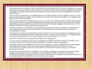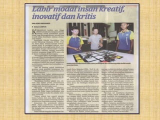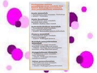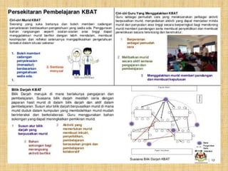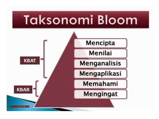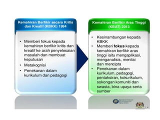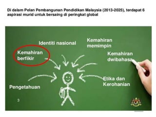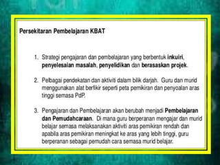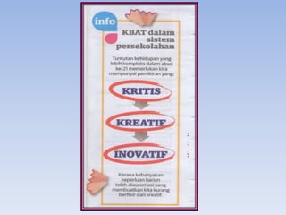 Dokumen ini membahas isu dan pentingnya kemahiran berfikir aras tinggi (KBAT) dalam pendidikan di Malaysia, termasuk pelaksanaan dan cabaran yang dihadapi oleh guru dan pelajar. Ia menyoroti keperluan untuk mengubah kaedah pengajaran tradisional dan meningkatkan penglibatan pelajar dalam proses pembelajaran. KBAT diharapkan dapat meningkatkan pemahaman dan prestasi pelajar dalam menghadapi dunia yang semakin berubah.