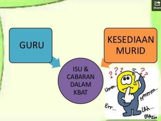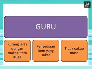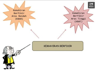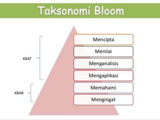 KBAT adalah kemahiran berfikir kritis yang mengutamakan kreativiti dan penyelesaian pelbagai cara dalam menghadapi masalah. Kemahiran ini meliputi aplikasi, analisis, penilaian, dan penciptaan, bertujuan meningkatkan pemahaman serta kesedaran pengetahuan. Contoh aktiviti KBAT mencabar pelajar untuk berfikir di luar kebiasaan dan menggunakan pembelajaran dari pelbagai disiplin dalam situasi kehidupan sebenar.