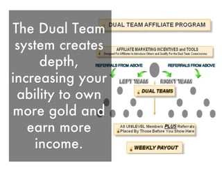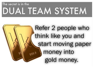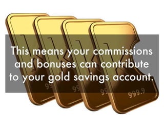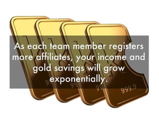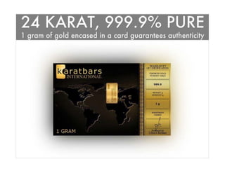 Karatbars International sells small gold bars and gift items with precious metals. They have expanded their product line over time to include collector's items for special occasions. Karatbars also offers limited edition collector cards that may appreciate in value more than the gold itself. The company operates in over 120 countries and sees major financial institutions as partners. It provides opportunities for affiliates to earn commissions and bonuses by purchasing business packages and helping others do the same.
