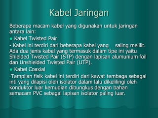 Dokumen ini membahas komponen fisik dan non-fisik dalam jaringan komputer, termasuk berbagai jenis kabel, konektor, dan perangkat seperti hub, switch, router, dan modem. Selain itu, juga dijelaskan tentang sistem operasi yang digunakan dalam jaringan, protokol jaringan yang memungkinkan komunikasi antar komputer, serta teknik pengkabelan yang mengikuti standar tertentu. Informasi ini penting untuk memahami cara membangun dan mengelola jaringan komputer dengan efektif.