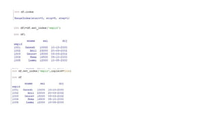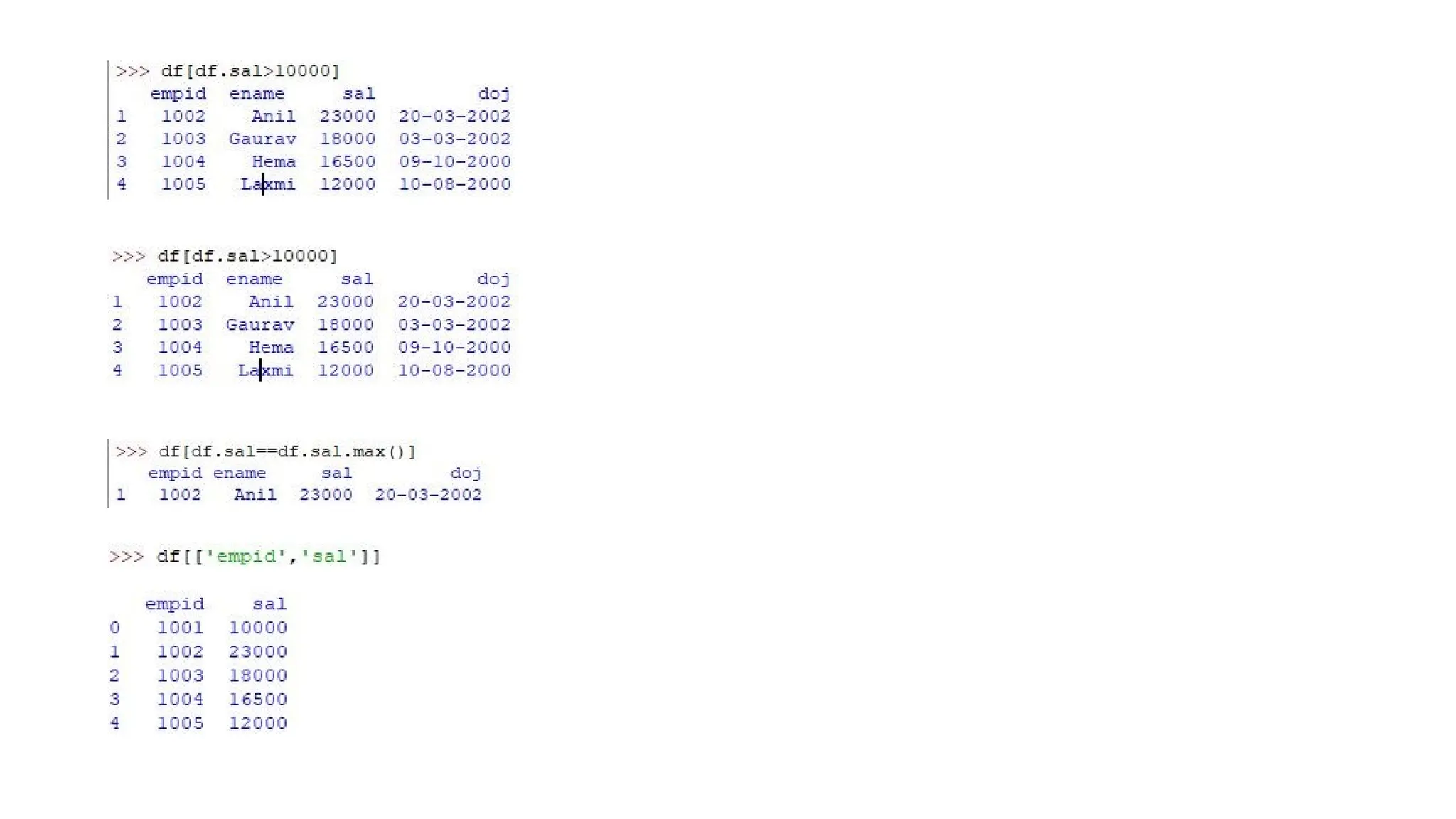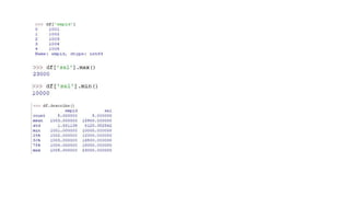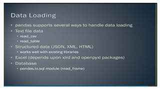 • Pandas is built on Numpy, Scipy and Matplotlib packages so that it uses