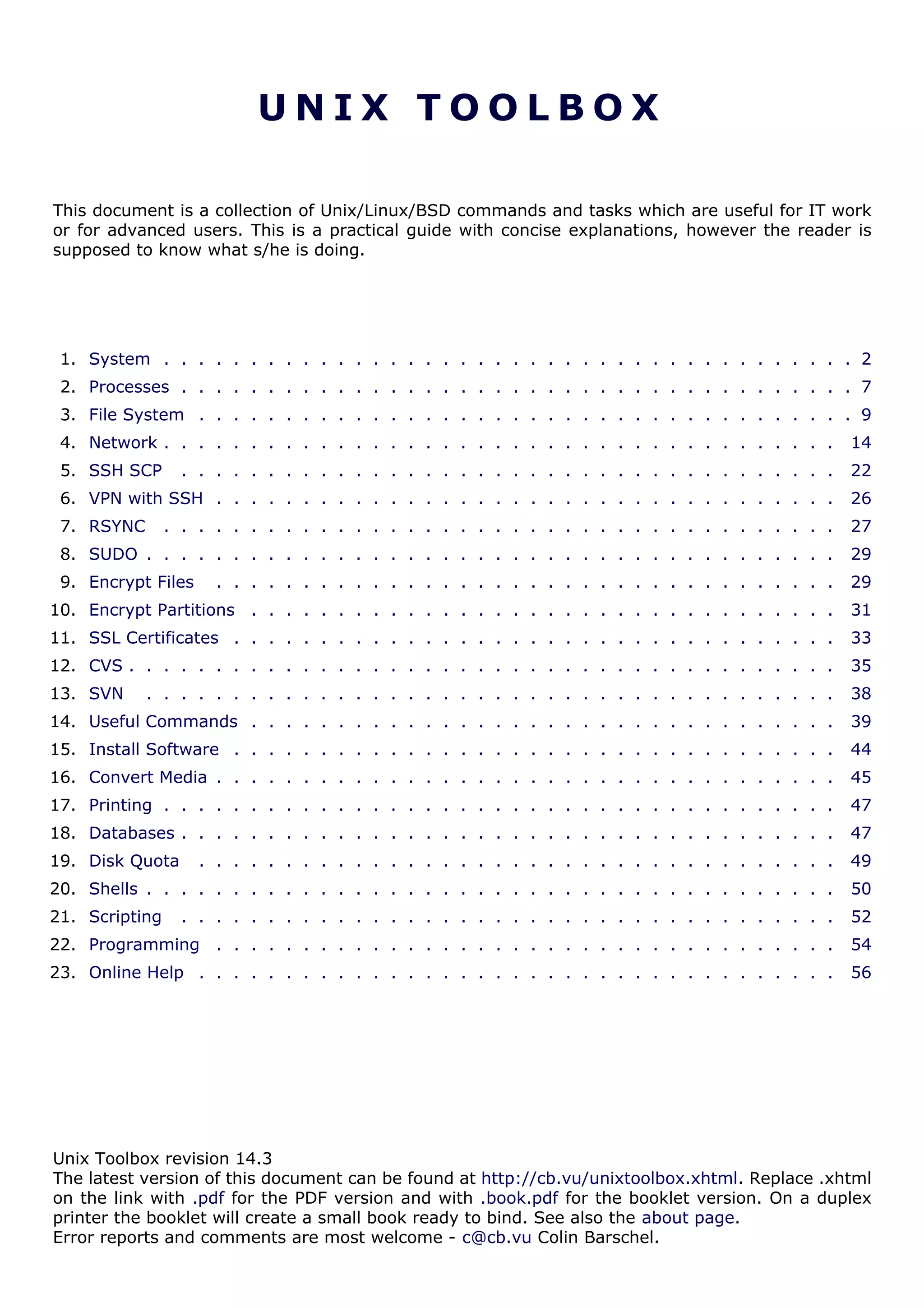 The document is a reference guide for Unix/Linux commands, organized into sections covering topics such as the system, processes, file system, network, and programming. It provides concise explanations of commands and tasks for advanced users, with the goal of being a practical toolbox reference. Sections include commands for viewing hardware and software information, monitoring system performance and activity, managing users and groups, and configuring process limits.