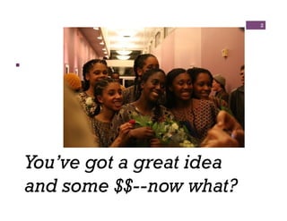 This webinar discusses best practices for bringing an idea to implementation, including defining project cycles and audience, assembling a team, setting goals and metrics, developing product requirements, establishing milestones and schedules, engaging communities, and planning for sustainability and revenue generation. Key recommendations include persona building for audiences, using project management tools, conducting user testing, regularly reviewing metrics and making adjustments, and developing multiple revenue strategies. Resources like circuit riders and publications are also suggested for additional guidance.