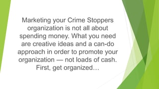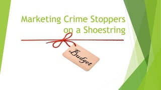 This document provides tips for marketing a Crime Stoppers organization with limited funds. It recommends developing strategies by looking at what other non-profits do, recruiting board members with marketing ideas, and tweaking ideas from other cities. Specific low-cost suggestions include using social media, blogs, websites, public relations, networking, print collateral, media outreach, billboards, email marketing, events, and community calendars. The overall message is that creative ideas and partnerships can promote an organization more than money alone.
