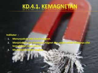 Dokumen ini menjelaskan tentang kemagnetan, termasuk sifat kutub magnet, cara membuat magnet, dan jenis-jenis magnet. Dikenalkan juga teori kemagnetan bumi dan medan magnet, serta pengaruh arus listrik terhadap kemagnetan. Selain itu, dibahas bahan magnetik dan non-magnetik serta jenis-jenis magnet berdasarkan sifat dan cara pembentukannya.