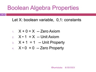 The document discusses properties and theorems of Boolean algebra. It defines key concepts like Boolean variables, constants, minterms, maxterms, and duality. Properties covered include idempotence, complement, absorption, consensus, commutative, associative, distributive, De Morgan's laws. Truth tables and canonical forms are also discussed. Duality and complementation are shown to derive equivalent expressions.