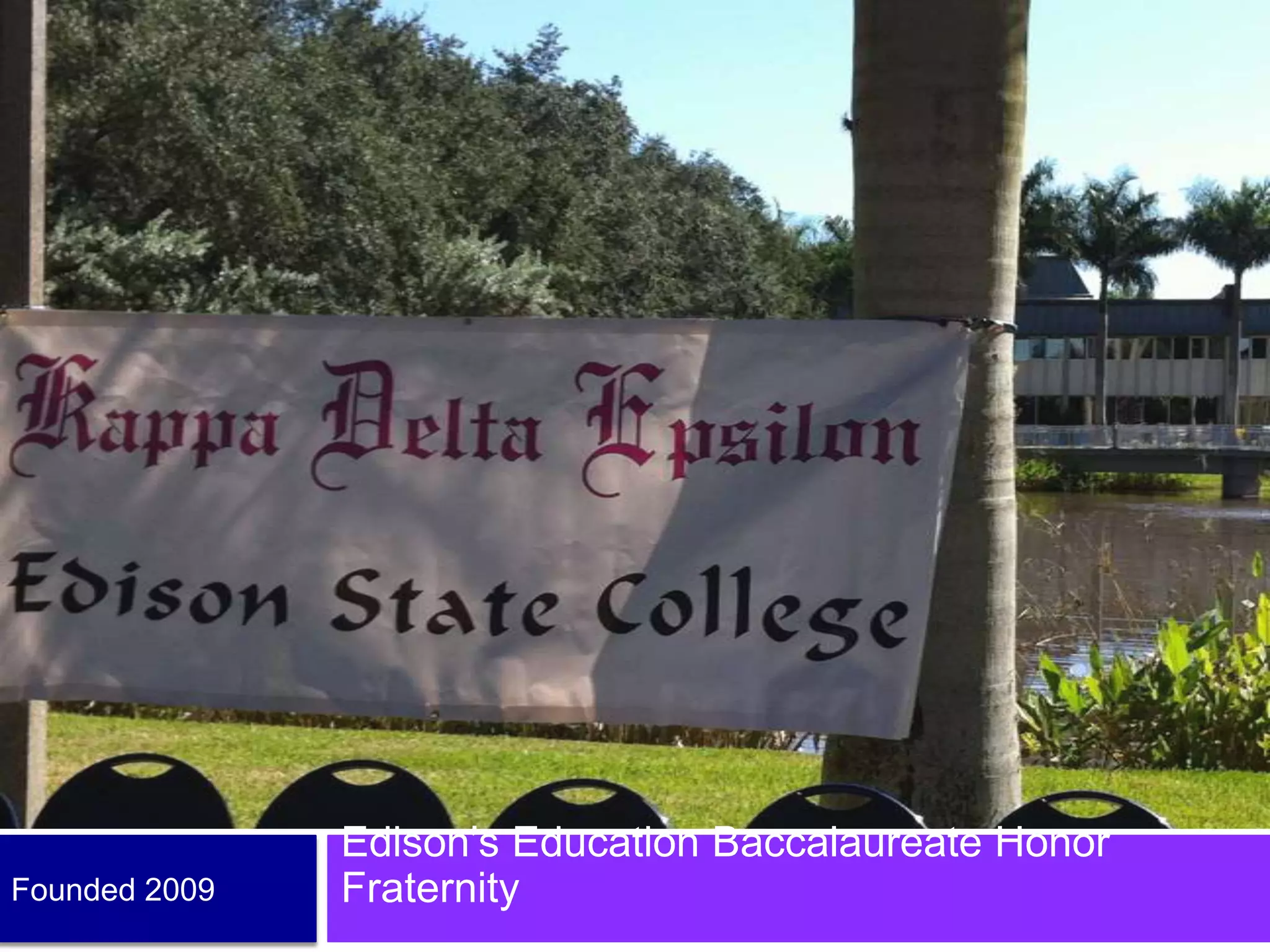 Kappa Delta Epsilon is an honorary educational fraternity founded in 2009 at Edison State College. It supports education by fostering fellowship and high academic standards among its over 200 members across several Florida counties. Members participate in community service projects helping local schools and families. Activities include fundraising, book and gift drives, tutoring, and volunteering. The fraternity also recognizes excellence through awards for outstanding members.