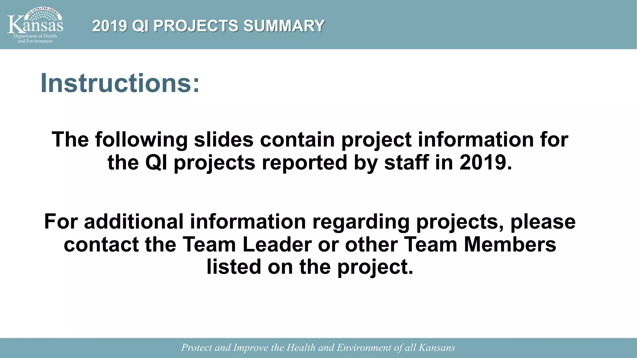 The document summarizes various quality improvement (QI) projects undertaken in Kansas in 2019, aimed at enhancing health and environmental conditions. Key initiatives include data cleanup for the K-Serv volunteer database, updates to project management processes, and improvements in laboratory documentation and tracking systems. Overall, the projects resulted in increased efficiencies, better data management, and improved communication across departments.