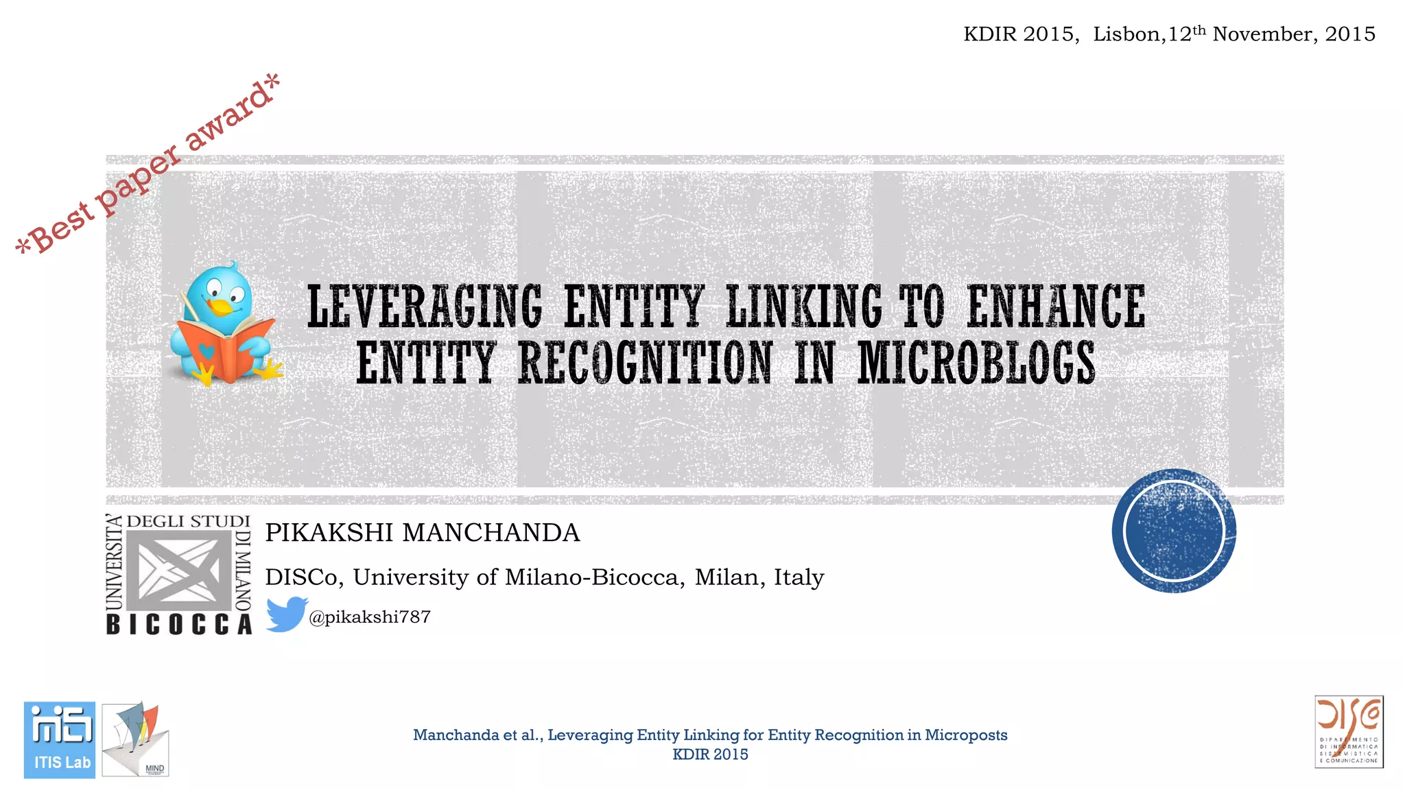 The document describes a framework for performing information extraction from social media posts. It leverages entity linking to improve named entity recognition in short texts. The framework includes components for named entity recognition, candidate retrieval from a knowledge base, entity disambiguation, and using the linking results to enhance the entity classifier. An evaluation on a dataset of tweets shows marginal improvements in entity classification accuracy when incorporating entity linking information. The authors discuss opportunities to better identify new emerging entities from social media and extract relationships to improve knowledge base curation.