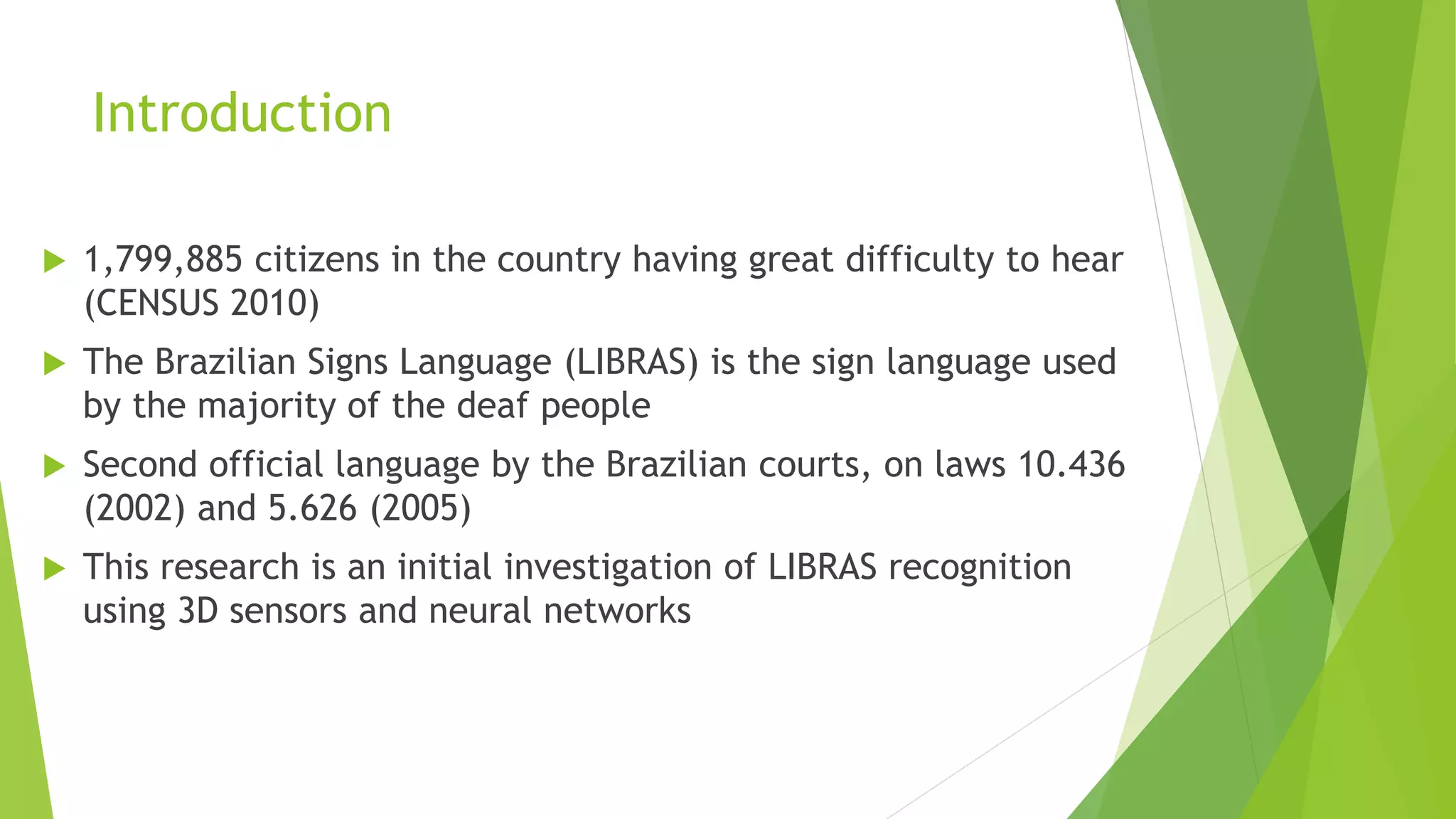 This research explores the recognition of Brazilian Sign Language (Libras) gestures using 3D sensor data and neural networks, addressing the needs of the deaf community in Brazil. It includes a case study with six participants recording various gestures, employing a multi-layer perceptron model that achieved a classification accuracy of 61.54% on unseen data. Challenges were faced in gathering accurate gesture samples and technical limitations of the chosen 3D sensor, with recommendations for future improvements and exploration of alternative models.