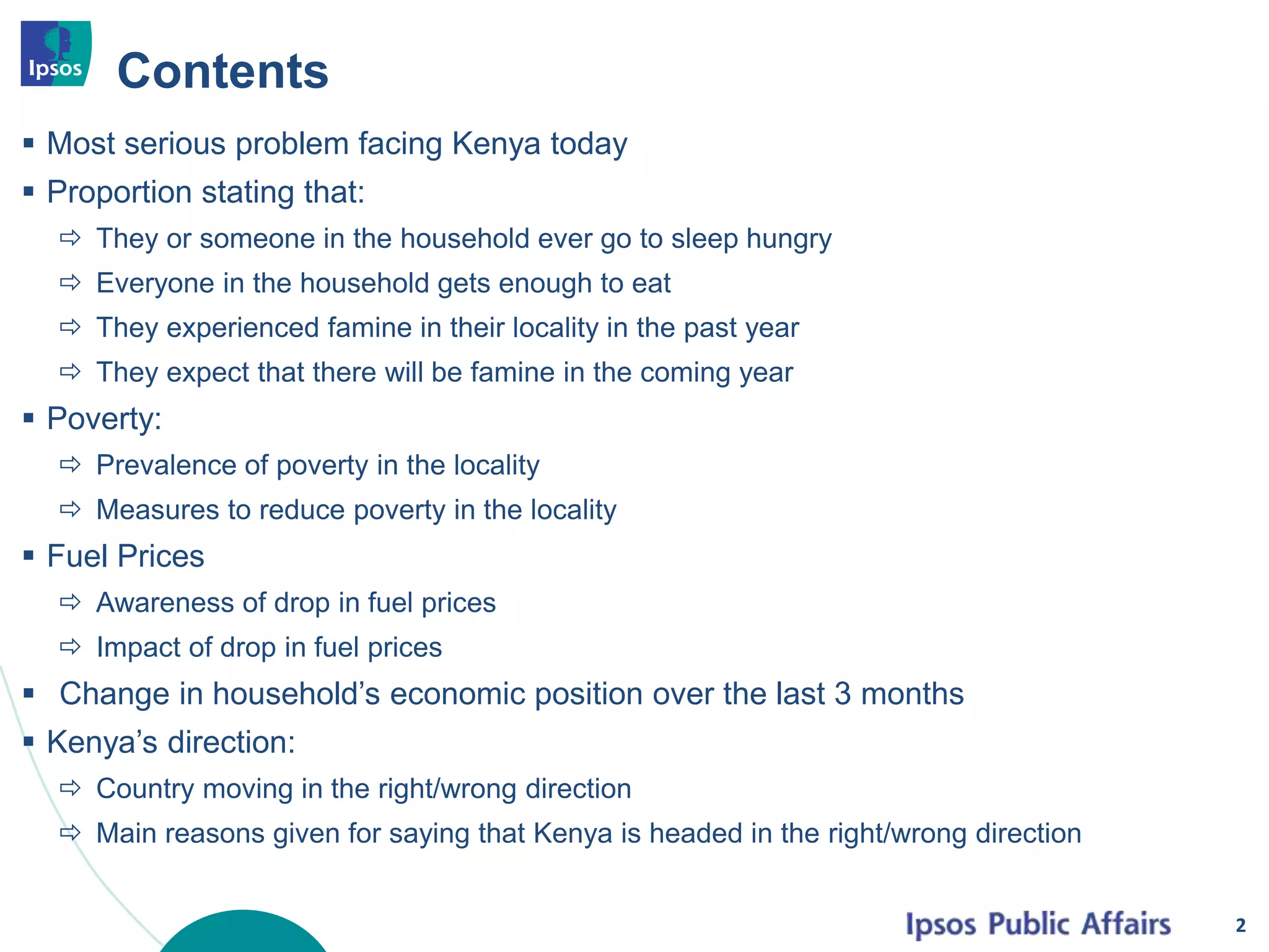 The document presents a press release by Ipsos detailing a poll regarding various social and economic issues in Kenya, conducted from March 28 to April 7, 2015, with a sample size of 1,964 respondents. Key findings include concerns about poverty, hunger, and the high cost of living, with significant proportions of the population reporting experiences of famine and economic hardships. The polling methodology and demographics of the respondents are also outlined, emphasizing the need for quality control in data collection.