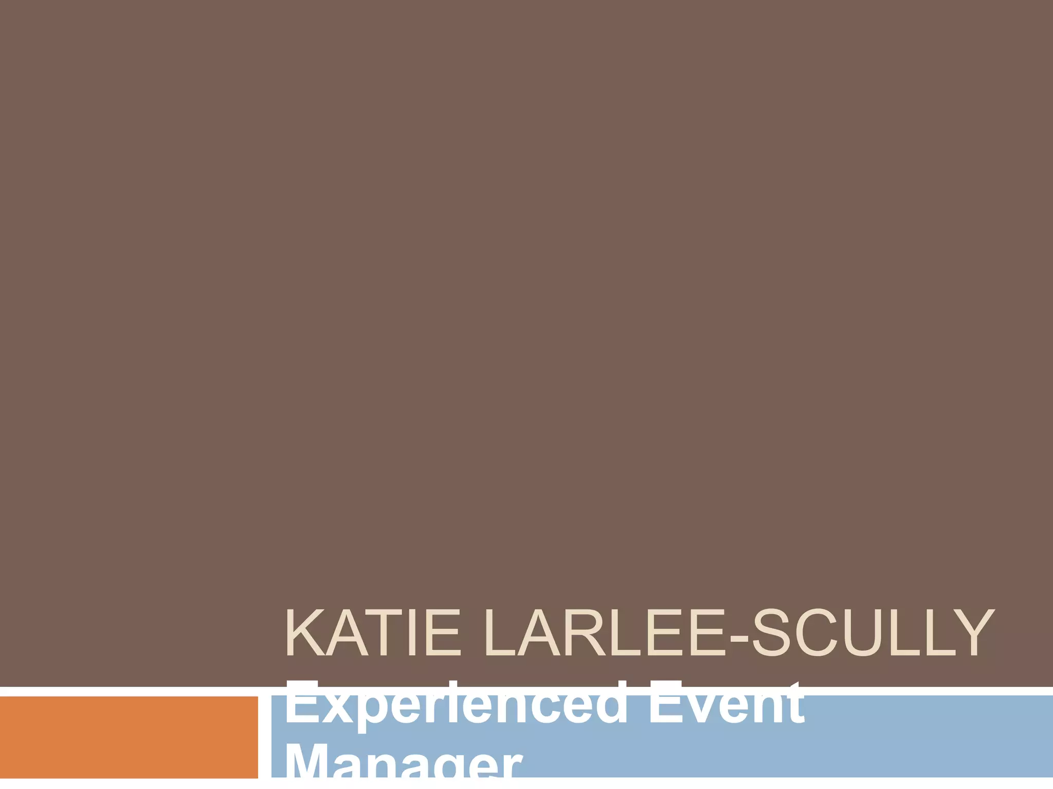 Katie Larlee-Scully is an experienced event manager seeking a new position. She has worked in event planning roles at various organizations, including as a meeting coordinator, employee activities manager, and conference services assistant. She has skills in areas such as maintaining budgets, negotiating contracts, venue selection, fundraising, staff management, attention to detail, client relations, and remaining calm under pressure.