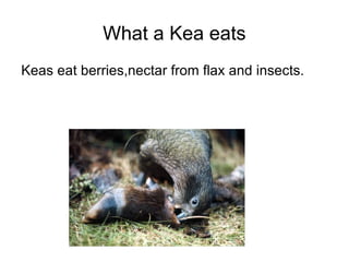 The Kea is an endangered mountain bird found in New Zealand. It eats berries, nectar, and insects and has light feathers that allow it to fly and land gently. Female Kea lay eggs that hatch, and then they provide food for their babies. Keas should not be harmed or killed due to their endangered status.