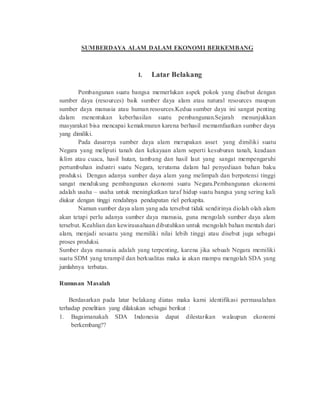 Dokumen ini membahas pentingnya sumber daya alam dan manusia dalam pembangunan ekonomi negara berkembang, serta tantangan yang dihadapi dalam pengelolaannya. Sumber daya alam yang melimpah perlu dikelola secara berkelanjutan untuk mencegah kerusakan lingkungan dan memaksimalkan manfaat ekonomi, sementara negara-negara kaya sumber daya sering mengalami masalah ekonomi seperti 'Dutch disease'. Selain itu, pembenahan sistem pemerintahan dan diversifikasi ekonomi diperlukan untuk mengoptimalkan pemanfaatan sumber daya alam.