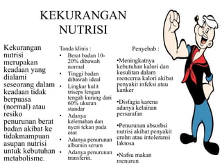 Dokumen tersebut membahas berbagai gangguan kebutuhan nutrisi seperti kekurangan nutrisi, kelebihan nutrisi, obesitas, malnutrisi, diabetes melitus, hipertensi, jantung koroner, kanker, aneroksia nervosa, dan faktor-faktor yang mempengaruhi kebutuhan nutrisi seperti pengetahuan, prasangka, kebiasaan, kesukaan, ekonomi, usia, jenis kelamin, tinggi dan berat badan, status kesehat