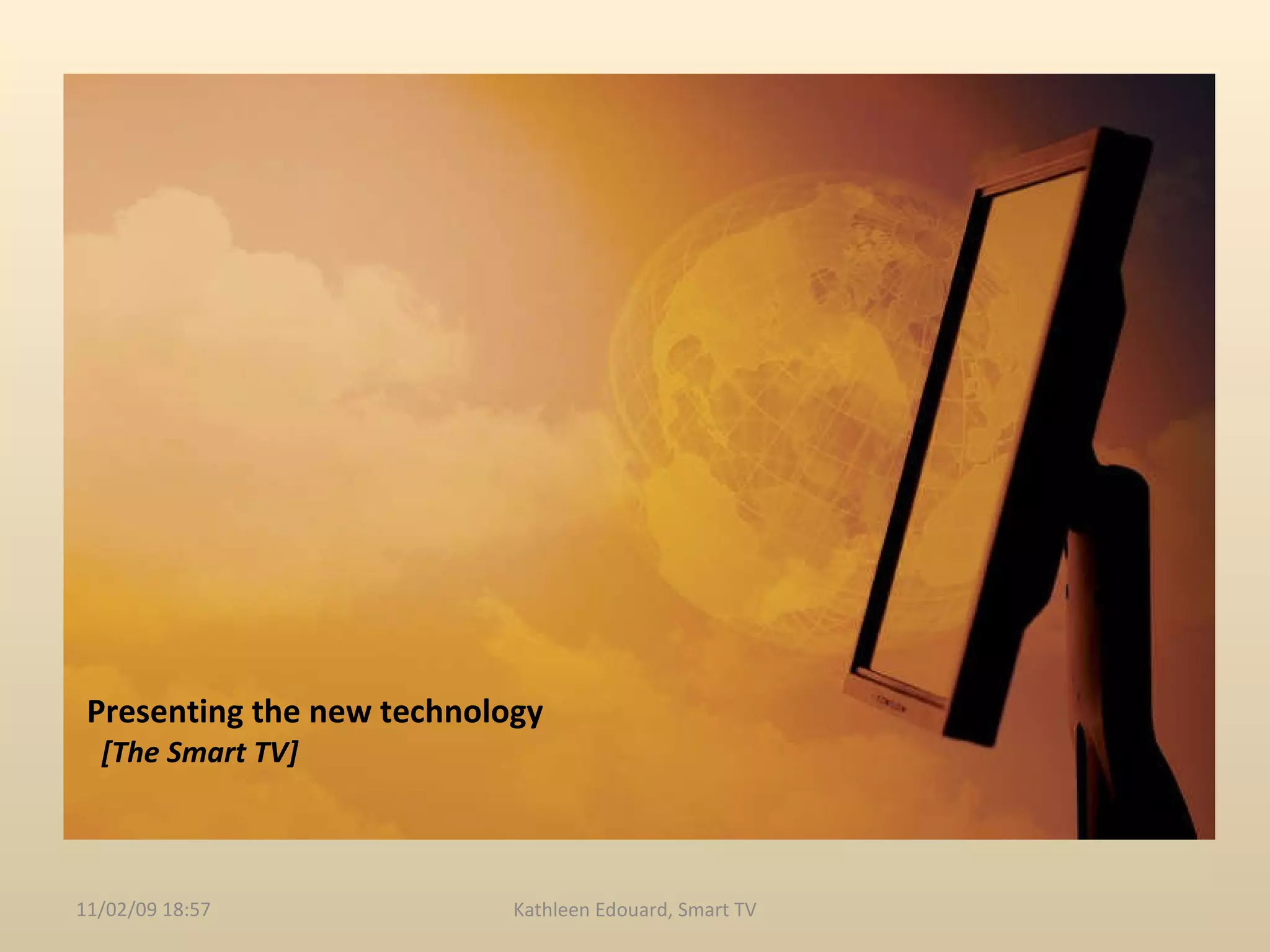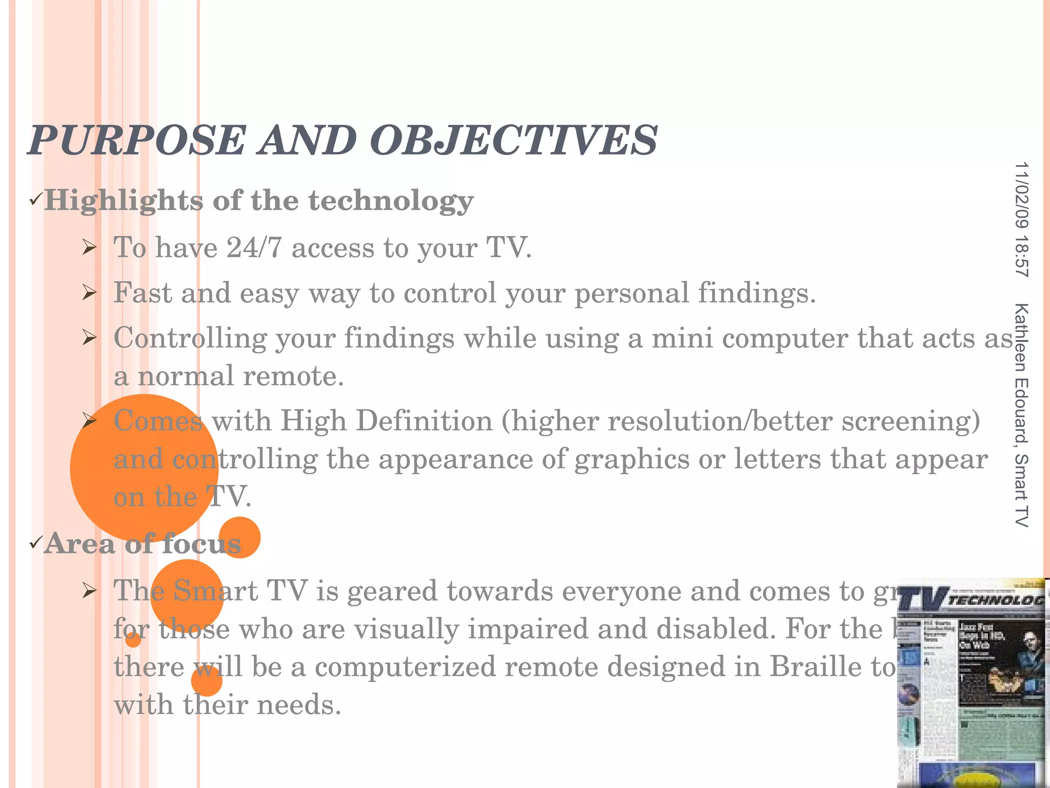 The document introduces a new smart TV technology that allows users to control their TV using voice commands or a computerized remote. The smart TV is aimed at making TV access easier for everyone, including the visually impaired through features like a Braille remote. It has advantages like hands-free control and special features such as voice recognition, multiple language options, and wireless music syncing to other devices.