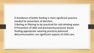 Diarrhea is defined as having 3 or more loose or liquid stools per day. It is commonly caused by viral, bacterial, and parasitic infections transmitted through contaminated food or water. The main symptoms are an increased frequency of loose stools, dehydration, and weight loss. Treatment involves oral rehydration therapy with oral rehydration solution and continued feeding. For severe cases, intravenous fluids and antibiotic treatment may be needed. Prevention relies on improved sanitation, hygiene, food safety, and access to clean water.