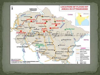 The document discusses the Kedarnath region in Uttarakhand, India, focusing on its geographical significance, the Kedarnath temple dedicated to Lord Shiva, and the catastrophic 2013 floods caused by a cloudburst that resulted in significant loss of life and destruction. The flooding was exacerbated by factors such as glacier melting due to global warming, environmental violations, and infrastructure development. Rescue operations involved various military and governmental efforts, and the document emphasizes the importance of environmental protection to mitigate future disasters.