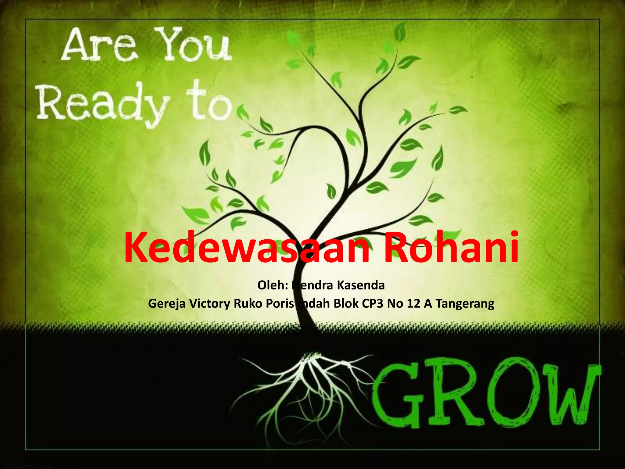 Dokumen tersebut membahas tentang pentingnya orang Kristen untuk tumbuh dan menjadi dewasa rohani. Hal ini diperlukan karena manusia harus selalu berubah dan bertumbuh, begitu pula dengan kehidupan rohani seseorang. Untuk menjadi dewasa rohani, diperlukan proses, disiplin diri, dan mengikuti teladan Yesus.