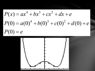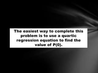 This document describes using a quartic regression equation to solve a physics problem by finding the value of P(0). It explains that the easiest way is to input the points into the STAT menu, calculate the quartic regression in StatCALC, which will produce the best fit quartic equation with an R squared value of 1. This equation can then be used to find that P(0)=2.5.