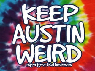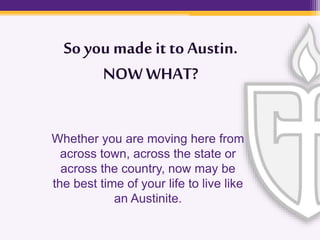 The document provides information for students new to Austin about things to know and do in the city before graduating. It highlights Austin's history and name change, accolades as a capital city, famous filming locations and celebrities, outdoor activities like visiting lakes and live music, cheap eats including BBQ and tacos, and things to experience on and around the Concordia campus. The bucket list at the end encourages students to join clubs, go to the lake, listen to live music, take hikes, eat from food trucks, keep Austin weird, see the bats, and serve on missions before graduating.