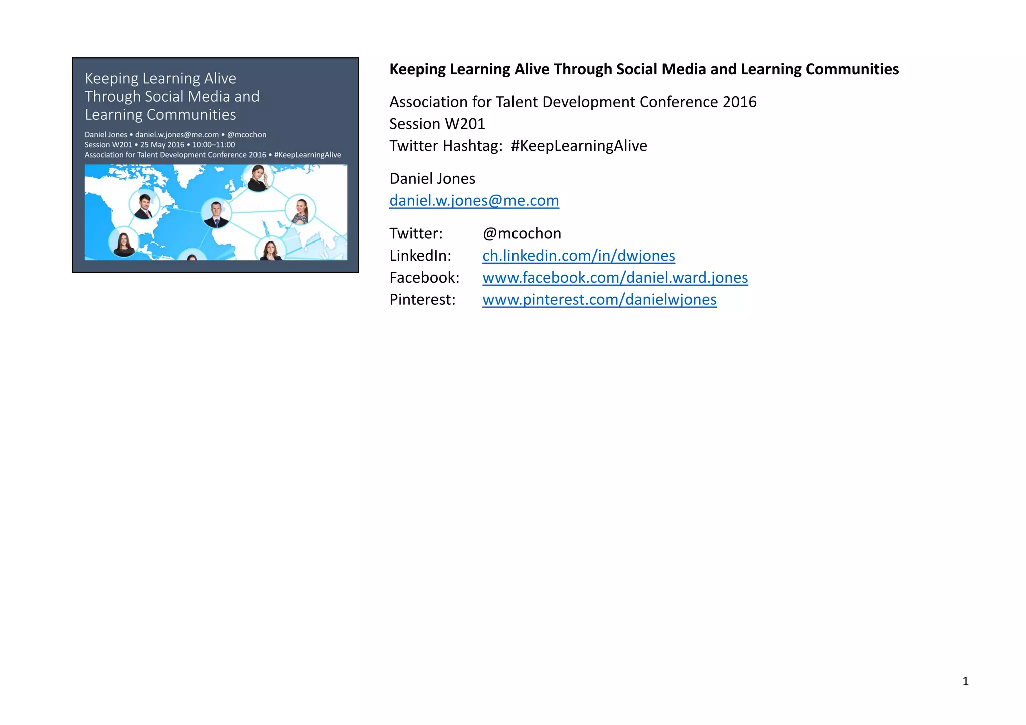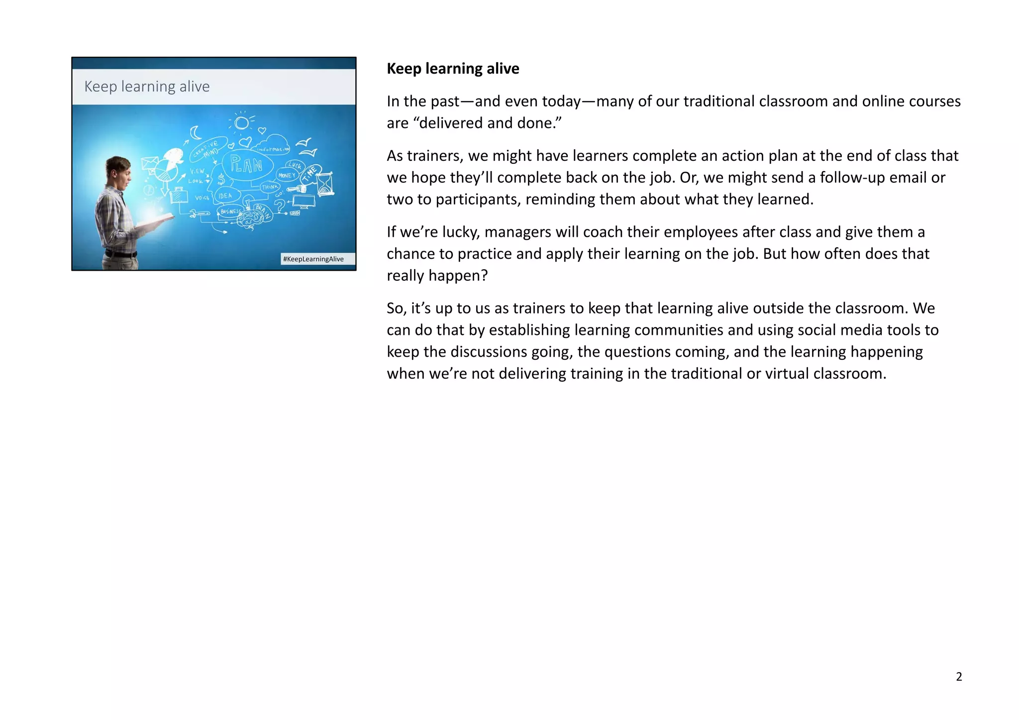 This document discusses using social media and learning communities to keep learning alive outside of traditional classrooms. It describes how a learning community manager can establish and maintain a community using tools like SharePoint, Yammer, blogs and webinars. The manager introduces ways to support both individual courses and long-term programs through social platforms. Specific examples provided include using hashtags and polls for courses, replacing courses with social-based lessons, and creating communities for certification programs or new employee onboarding.