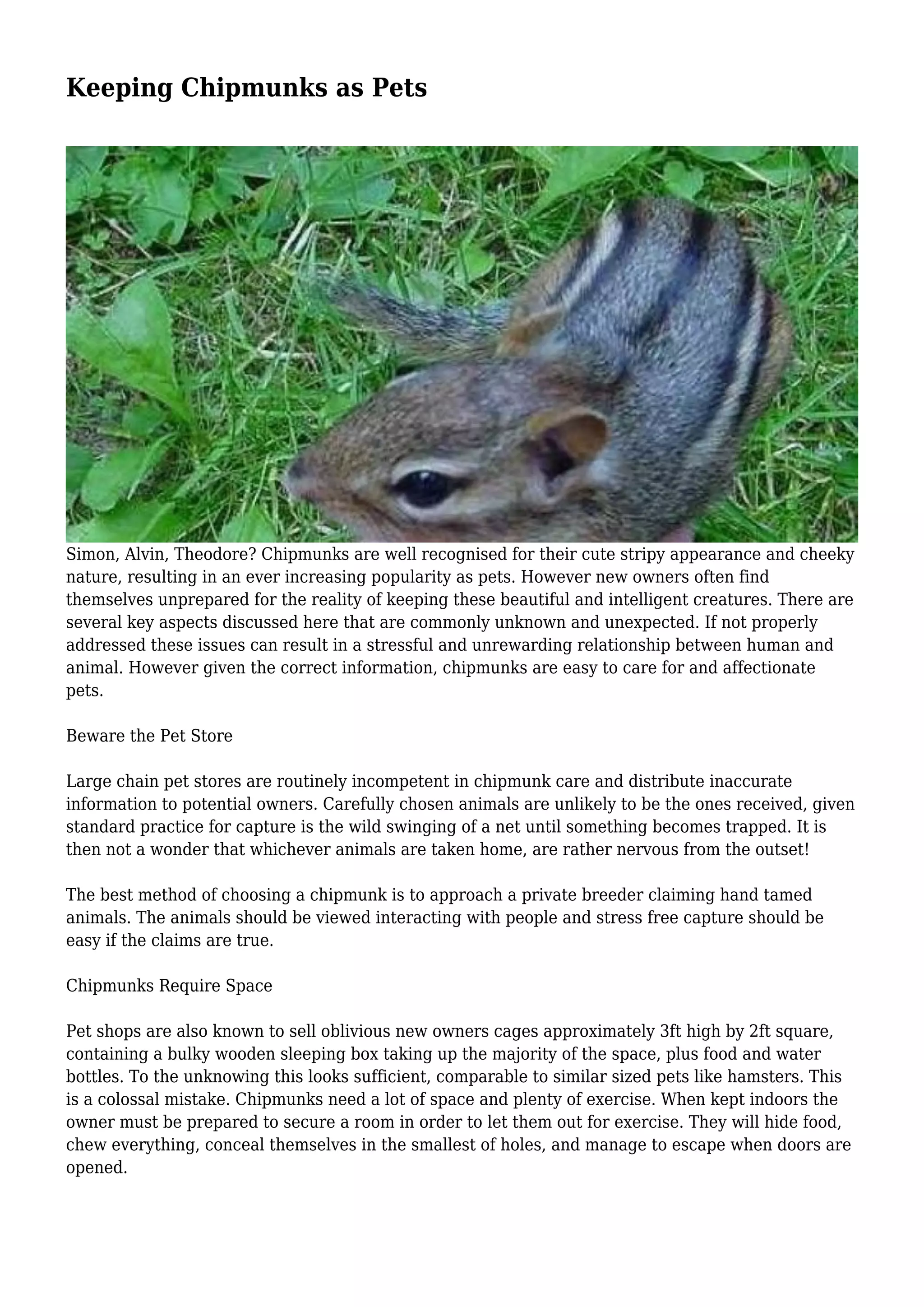 Chipmunks are increasingly popular pets known for their cute appearance but require significant care and understanding from owners. They need ample space, ideally in an outdoor aviary, and should be obtained from reputable breeders to ensure a positive experience. With proper care, patience, and interaction, chipmunks can form affectionate bonds with their owners.