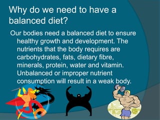 A balanced diet containing carbohydrates, fats, dietary fiber, minerals, protein, water and vitamins is necessary to ensure healthy growth and development. Unbalanced or improper nutrient consumption can result in a weak body. Unhealthy eating habits can increase the risk of obesity, eye problems, circulatory and kidney problems, and type 2 diabetes. Nutrients from food are used to build tissues, produce energy, and keep the body healthy. A balanced diet containing the necessary nutrients each day is important for overall health and well-being.