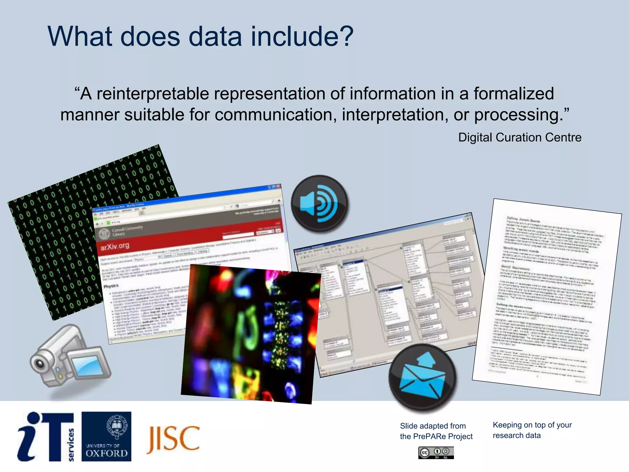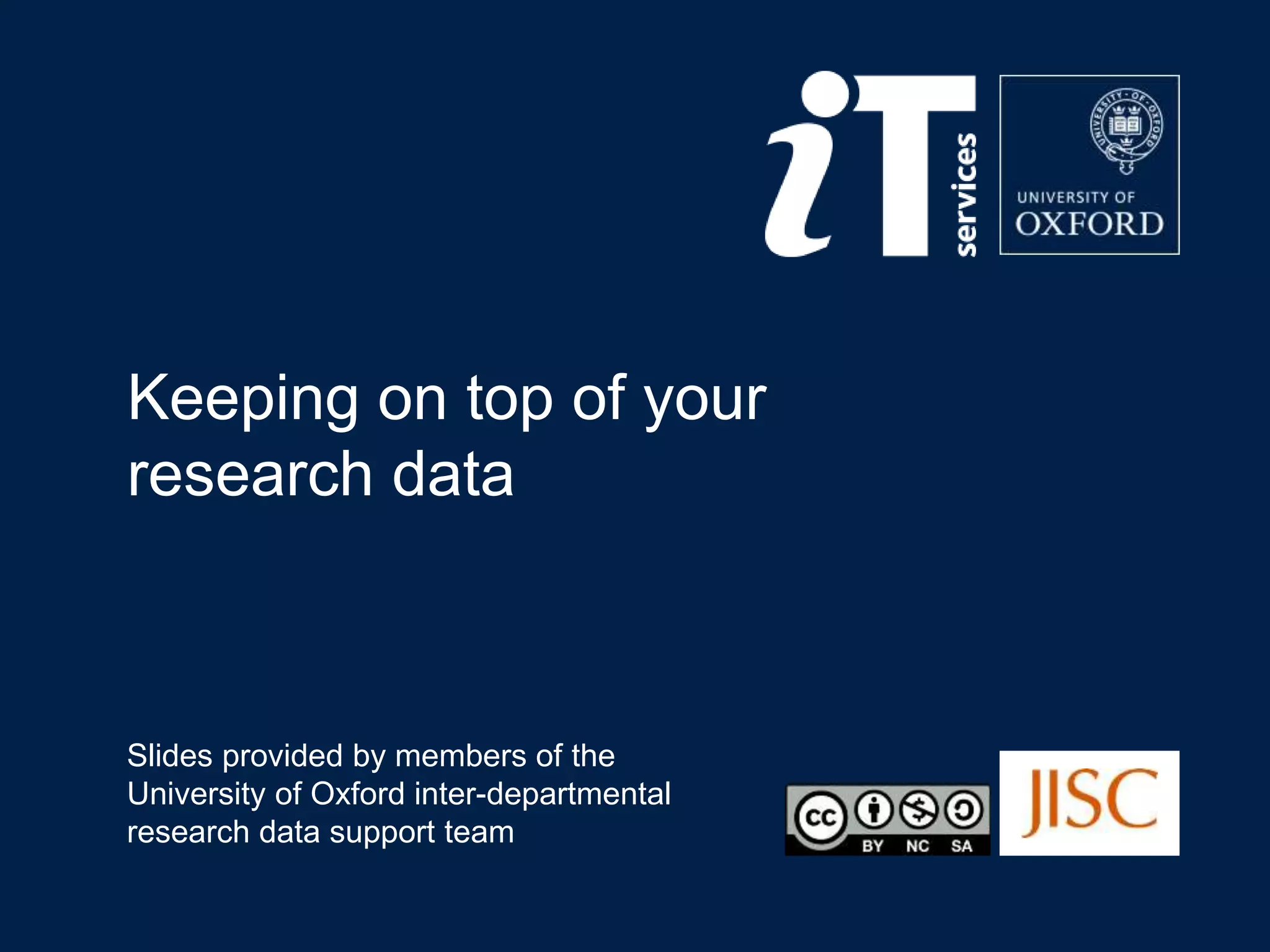 The document outlines the importance of effective research data management, emphasizing the need for accurate, complete, and securely stored data that can be shared post-project in compliance with university policies and funding requirements. It discusses creating a data management plan, organizing and naming files effectively, utilizing appropriate software tools, and the value of training and support services provided by the University of Oxford. Additionally, it highlights the significance of data backups and the various resources available for researchers to enhance their data management practices.