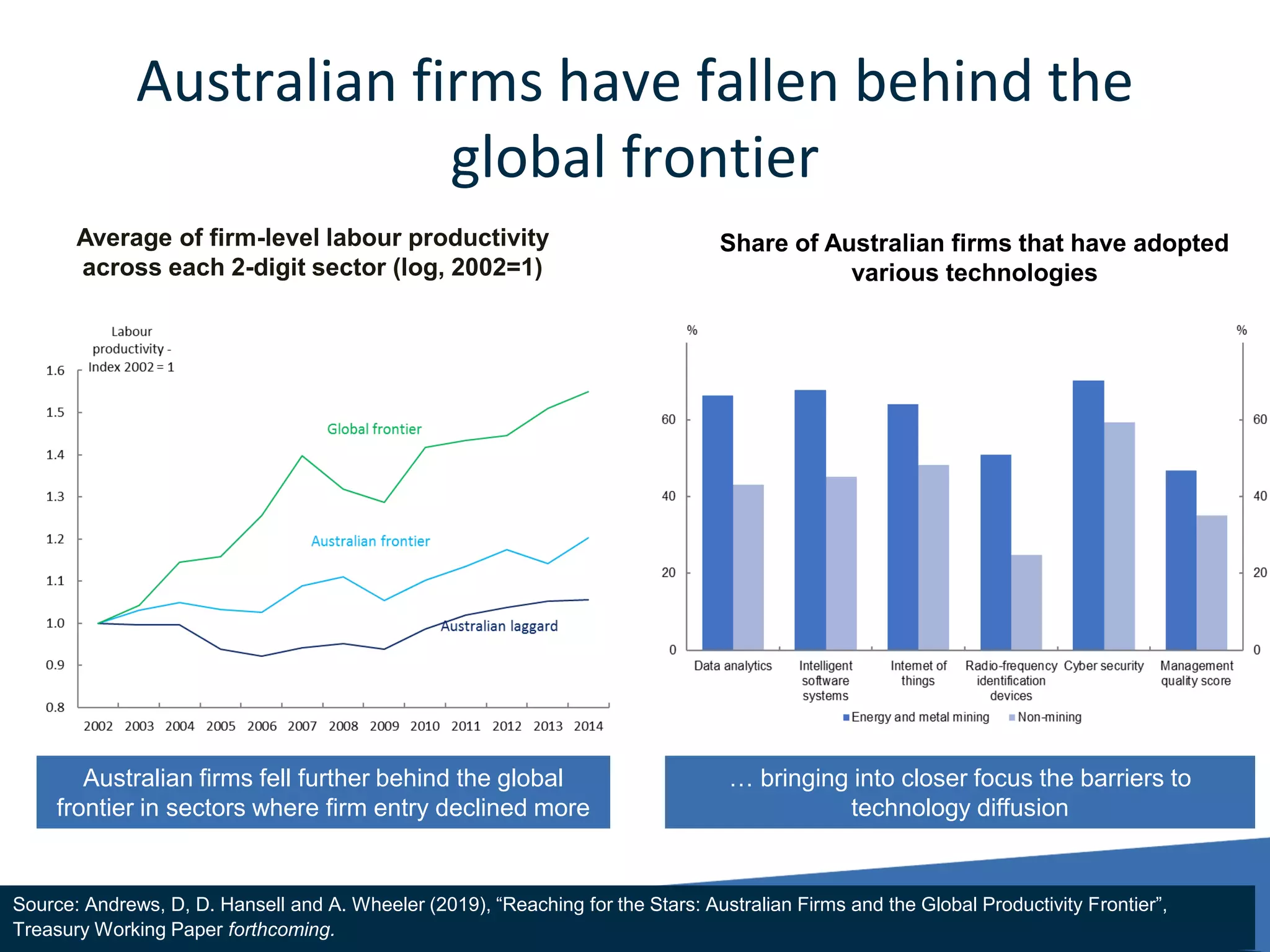 1) Australian firms have fallen behind global productivity frontiers in many industries as firm entry rates have declined, slowing technology diffusion. 2) Declining business dynamism, seen through lower firm entry rates, job switching rates, and excess job reallocation, has undermined productivity and wage growth in Australia. 3) Weaker firms are surviving longer in Australia as reallocation towards more productive firms has slowed, contributing to rising incumbency bias.