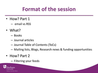 This document provides guidance on using RSS feeds and email alerts to stay up to date with new research materials. It discusses setting up feeds from sources like library catalogs, journal publishers, and news sites to receive automatic updates on new books, articles, or other relevant information. Instructions are included on creating feeds for specific resources and filtering feeds to only receive the most essential updates.