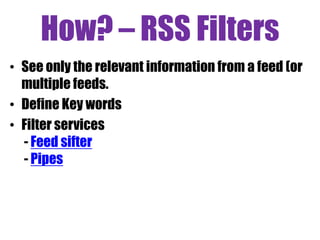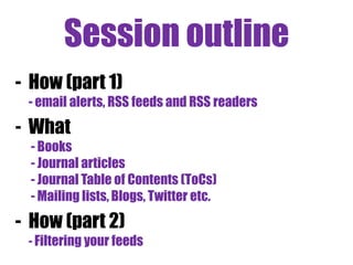 The document outlines strategies for keeping up with emerging research, including methods such as email alerts, RSS feeds, and academic networks. It provides a structured approach with practical tasks for setting up and managing RSS feed readers, creating alerts for library catalogs, journal articles, and tables of contents. Additionally, it highlights various resources and coping strategies for effective information management in research.