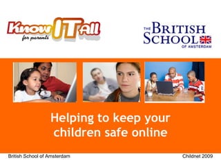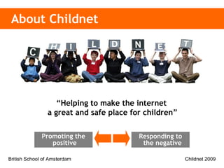 The document discusses internet safety for children and provides advice for parents. It notes that most children use computers, phones and the internet but parents may lack knowledge about new technologies. While the internet provides opportunities to connect, learn and create, it also poses risks like exposure to inappropriate content, cyberbullying, and sharing private information. The document outlines specific risks and provides tips for parents like using filtering software, discussing rules for internet use, and what to do if children encounter problems online.