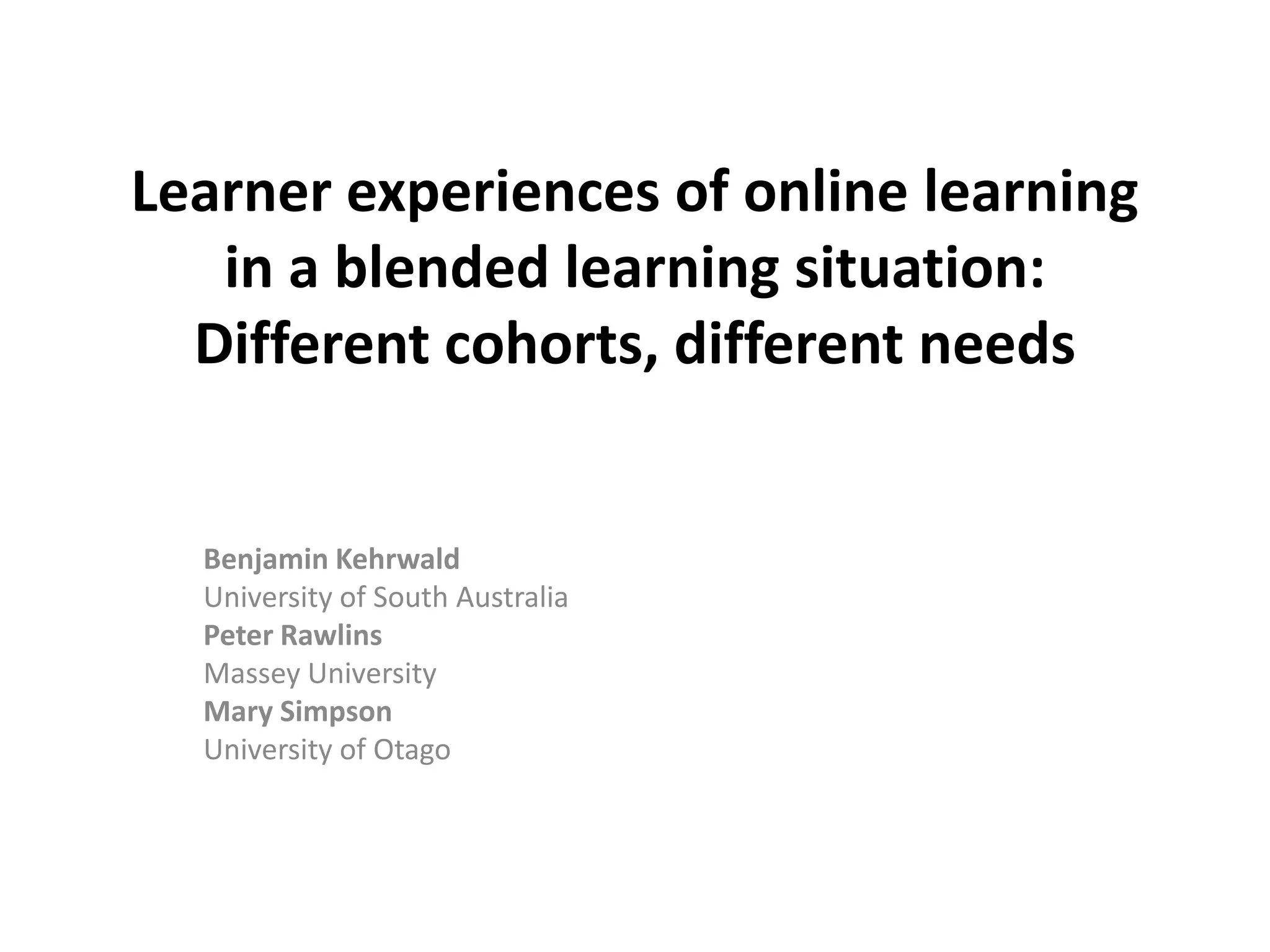 This document summarizes the findings of a formative evaluation of learner experiences in a blended learning education program with three distinct cohorts: students at the main campus, regional campus, and external students. A survey found significant differences in experiences between the cohorts, with regional campus students reporting less satisfaction than others in areas like online comfort and interaction. The evaluation raised questions about how cohort needs and expectations align with the blended model offered, and how teaching and support can be tailored to better meet learner needs and provide more equitable experiences across cohorts.
