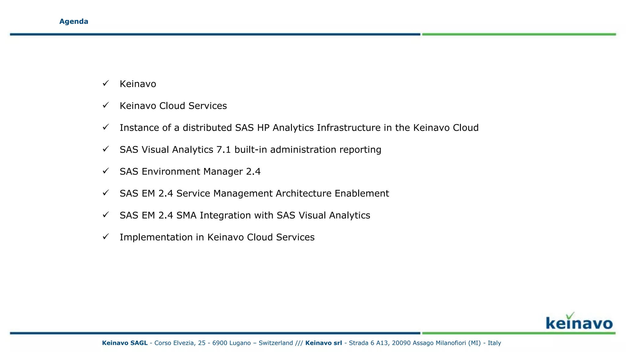 The document outlines the administrative reporting features of SAS Visual Analytics 7.1 and its integration with SAS Environment Manager 2.4, focusing on the architecture and functionality. It provides an overview of the services offered by Keinavo, including cloud solutions and enhanced data management tools for SAS environments. Key features include built-in reporting capabilities, customizable monitoring, and automated data processing to support analytics and resource management.