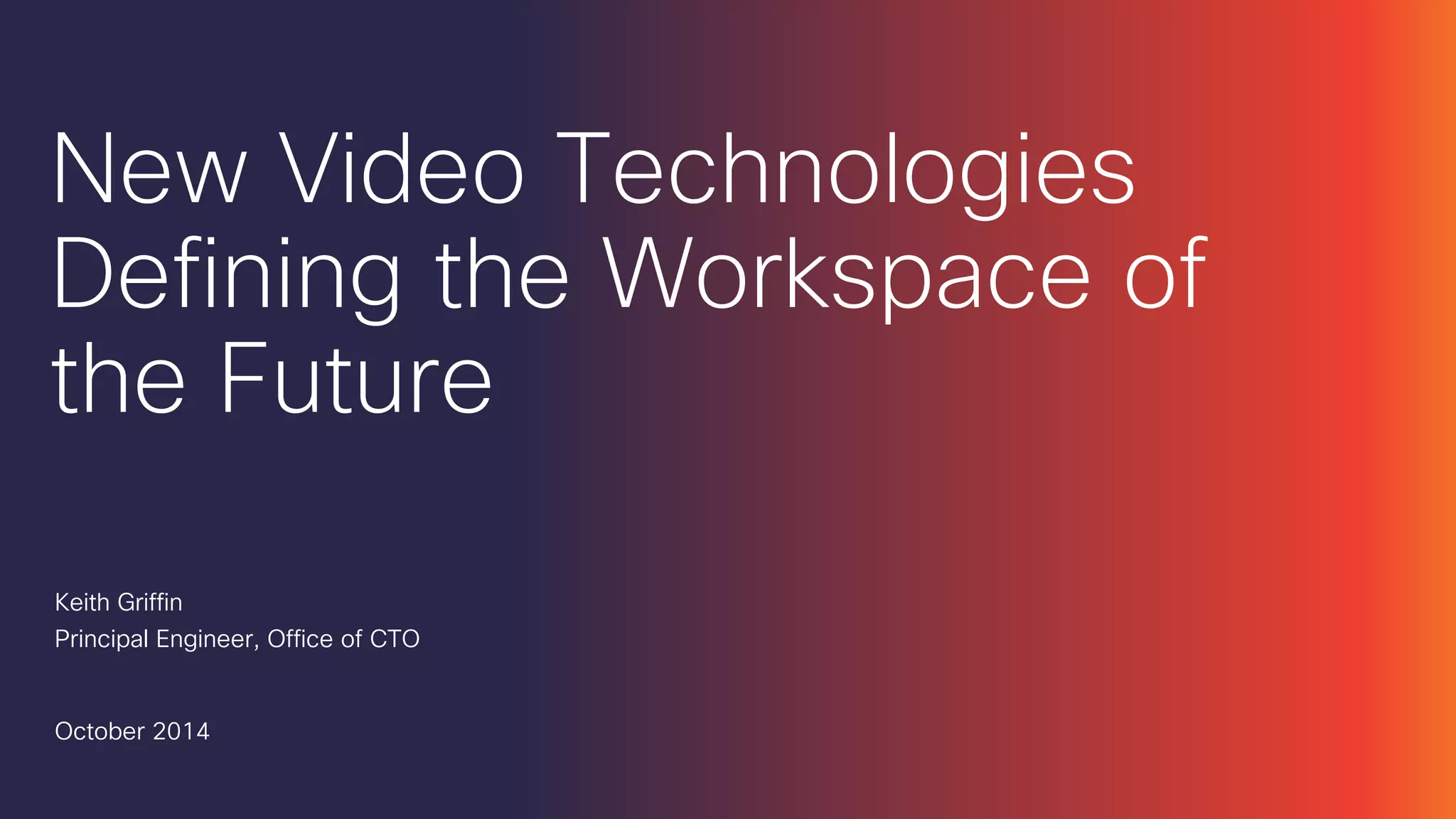 The document discusses the rapid evolution of video technologies and their impact on future workspaces, highlighting the accelerated pace of innovation and adoption of new internet devices. It emphasizes the growing importance of real-time communications in web browsers through initiatives like WebRTC and RTCWeb. The overall message is centered around creating a more interactive and interconnected work environment using these advancements.