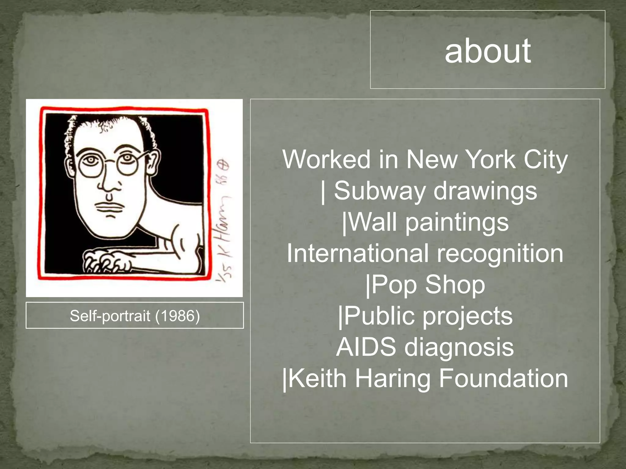Keith Haring was an American artist known for his colorful, bold style using action marks and figures. He gained international recognition in the 1980s for his Pop Shop and public projects. Haring did significant AIDS activism through his foundation before his early death in 1990 at age 31, leaving behind a vibrant body of work celebrating universal themes of peace, love and human connection.