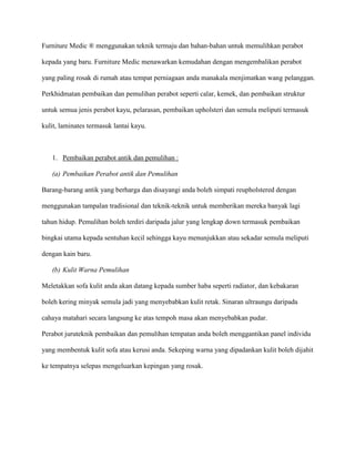 Furniture Medic adalah syarikat pembaikan dan pemulihan perabot terbesar di dunia yang menawarkan perkhidmatan berkualiti tinggi untuk pemilik rumah dan perniagaan. Mereka pakar dalam pembaikan perabot kayu, termasuk barang antik, dan menyediakan penyelesaian yang berpatutan berbanding penggantian. Dengan juruteknik terlatih dan menggunakan teknologi canggih, mereka memulihkan dan meningkatkan kecantikan serta ketahanan perabot sambil menjimatkan kos pelanggan.
